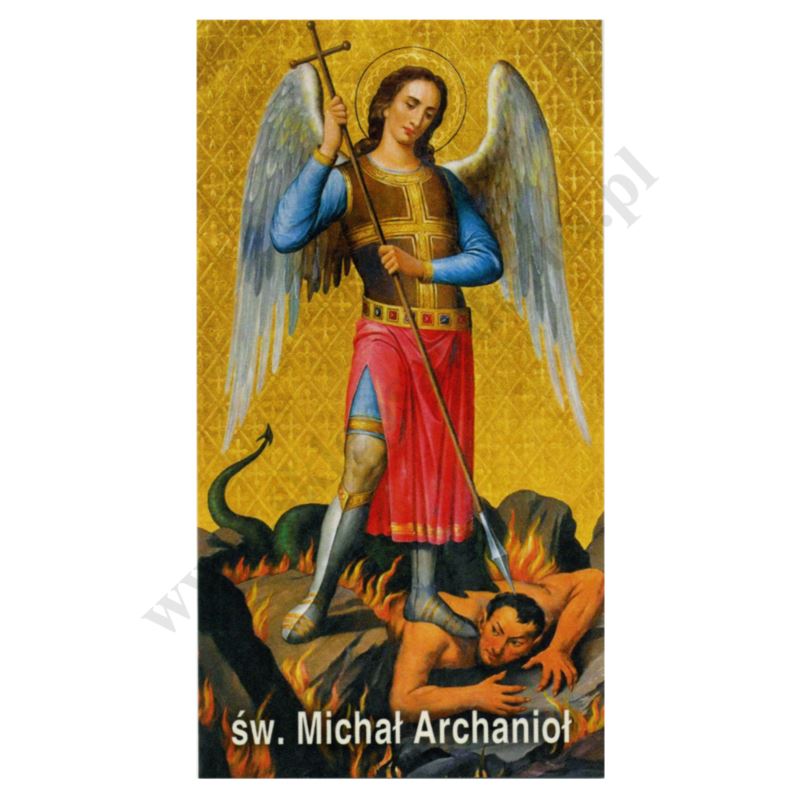Obrazek św. Michała Archanioła, lakierowany w formacie 7 x 13 cm, na rewersie tekst modlitwy do św. Michała Archanioła. Sprzedaż w paczce po 25 szt.