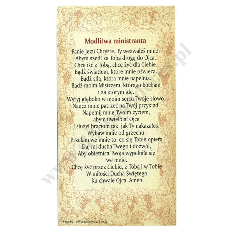 Obrazek z wizerunkiem Świętego Dominika Savio, lakierowany w formacie 7 x 13 cm, na rewersie tekst modlitwy ministranta. Sprzedaż w paczce po 100 szt.