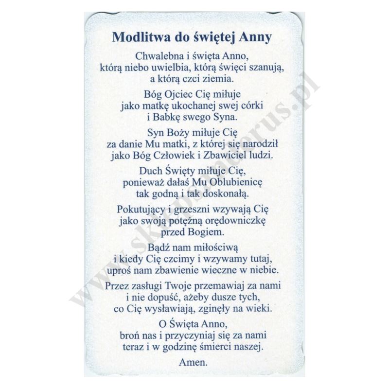 Obrazek przedstawiający Świętą Annę, brokatowany w formacie 6.4 x 10.6 cm z tekstem modlitwy do Świętej Anny na rewersie. Sprzedaż w paczce po 100 szt.