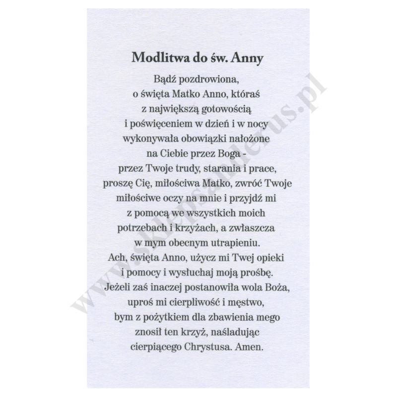Obrazek przedstawiający wizerunek Świętej Anny, lakierowany UV w formacie 6.5 x 11 cm z tekstem modlitwy do Świętej Anny na rewersie. Sprzedaż w paczce po 100 szt.