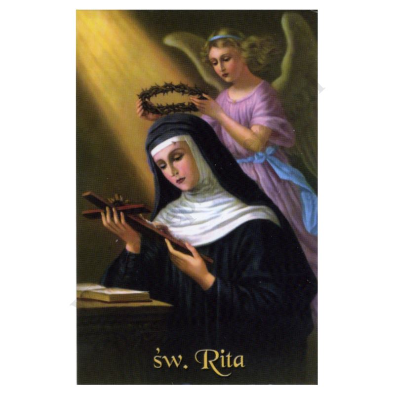 Obrazek Świętej Rity, lakierowany w formacie 6.5 x 10 cm, na rewersie modlitwa do Świętej Rity. Sprzedaż w paczce po 100 szt.