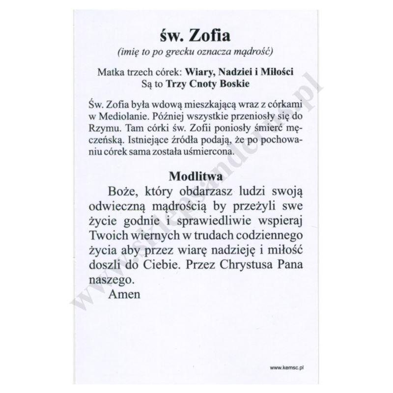 Obrazek z wizerunkiem Świętej Zofii, lakierowany w formacie 6.5 x 10 cm z krótkim życiorysem i modlitwą do Świętej Zofii. Sprzedaż w paczce po 100 szt.