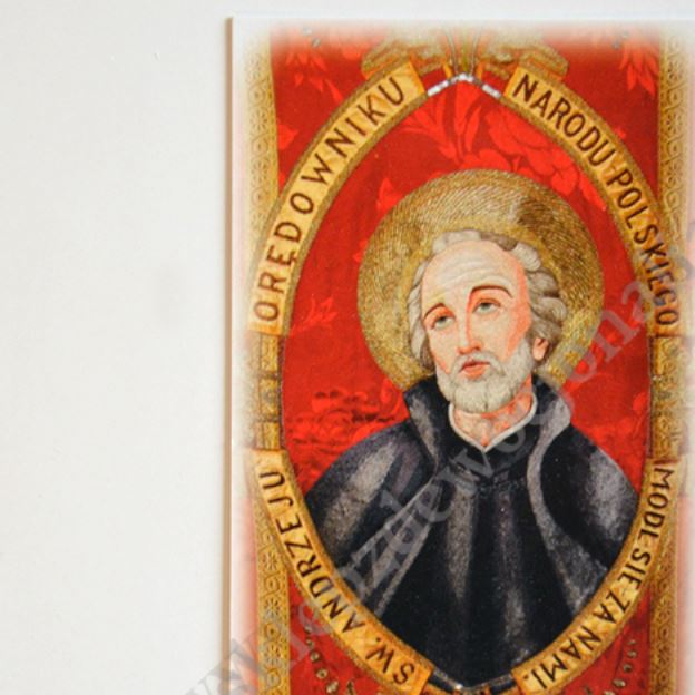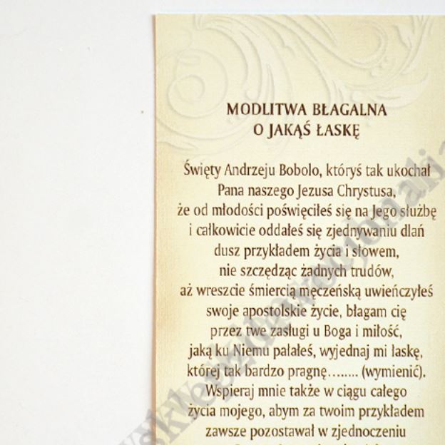 Obrazki Świętego Andrzeja Boboli w formcie 7 x 13 cm pakowane po 100 szt. na rerwersie obrazka modlitwa błagalna o jakąś łaskę.
