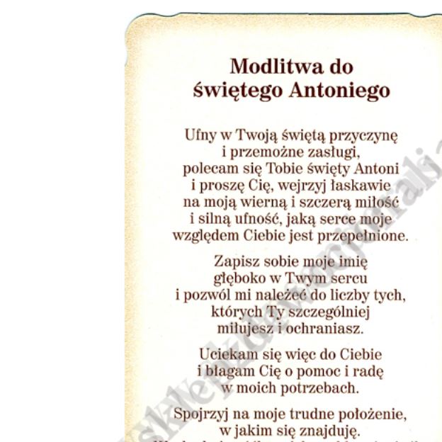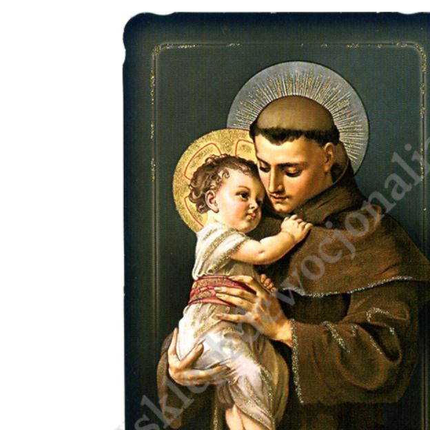 Obrazek z wizerunkiem Świętego Antoniego, brokatowany w formacie 9 x 14.8 cm z tekstem molditwy do Świętego Antoniego na rewersie. Sprzedaż w paczce po 100 szt.