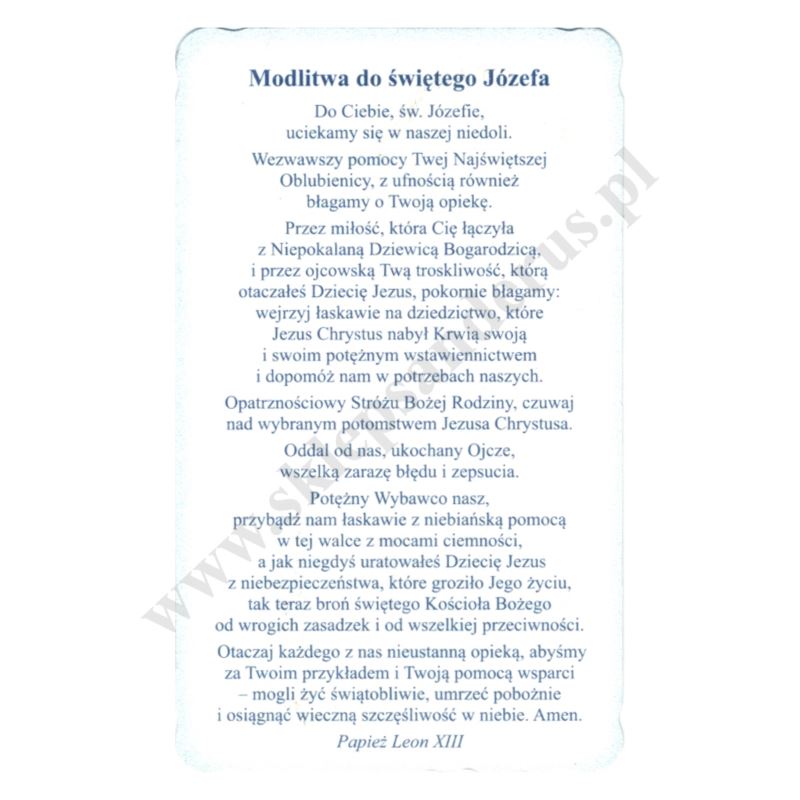 Obrazek Świętego Józefa, lakierowany i brokatowany w formacie 6.5 x 10.5 cm z modlitwą do świętego Józefa na rewersie. Sprzedaż w paczce po 100 szt.