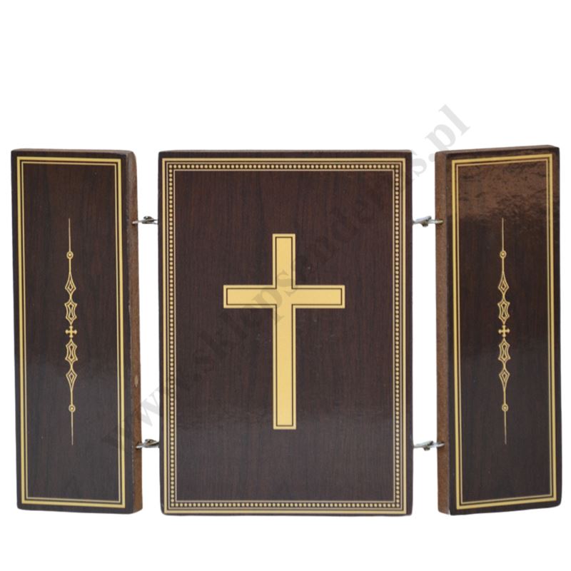 Tryptyk przedstawiający Świętego Józefa oraz anioły wykonany z drewna, format po rozłożeniu 12.5 x 8.4 cm.