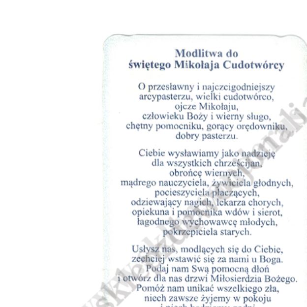 Obrazek Świętego Mikołaja, brokatowany w formacie 6.5 x 11 cm z modlitwą na rewersie. Sprzedaż w paczce po 100 szt.