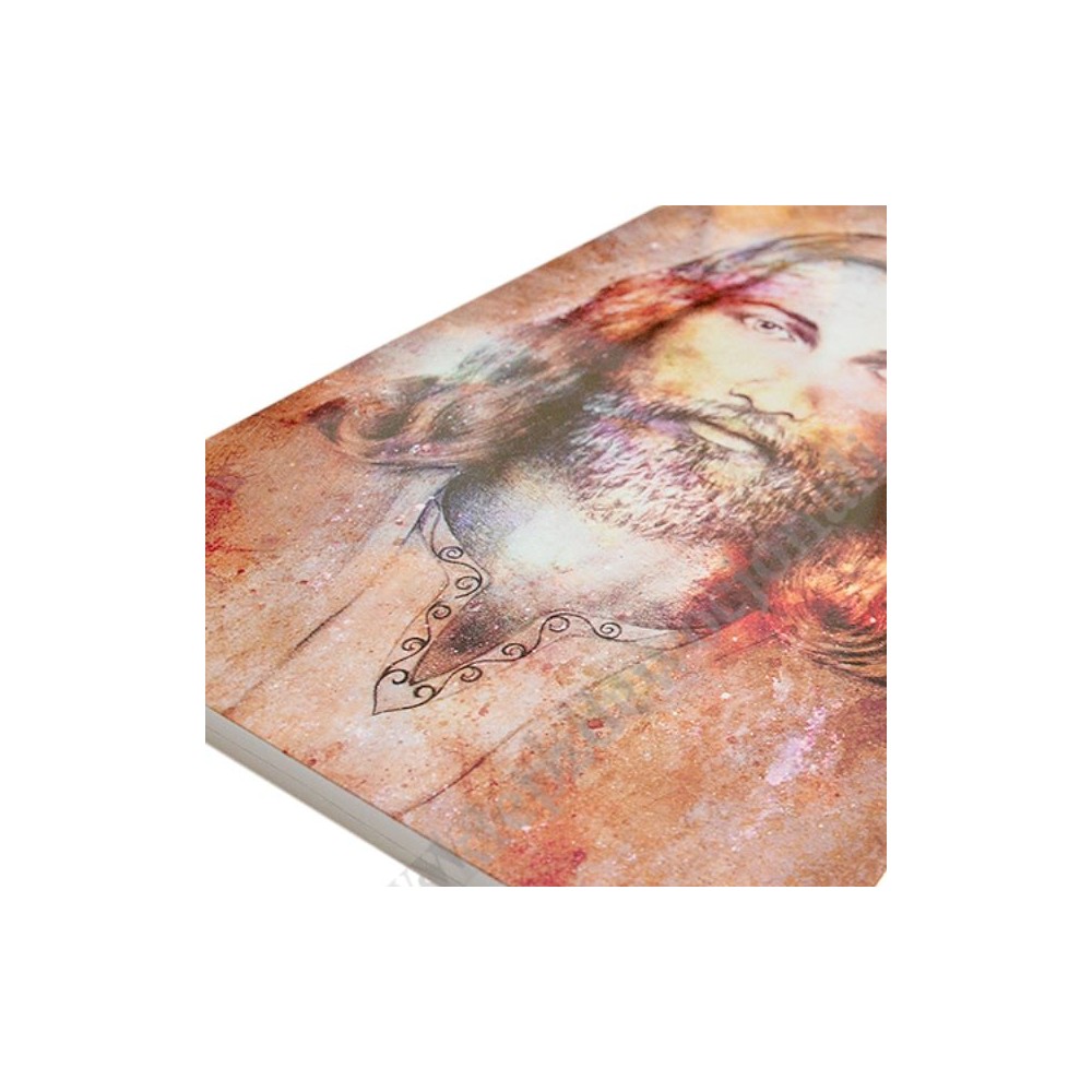 Nowoczesny obraz przedstawiający Oblicze Pana Jezusa o szerokości 26 cm i wysokości 43 cm, grubość 1.8 cm. Na produkcie widoczna jest folia zabezpieczająca produkt przed uszkodzeniem, którą przed zawieszeniem należy ściągnąć.