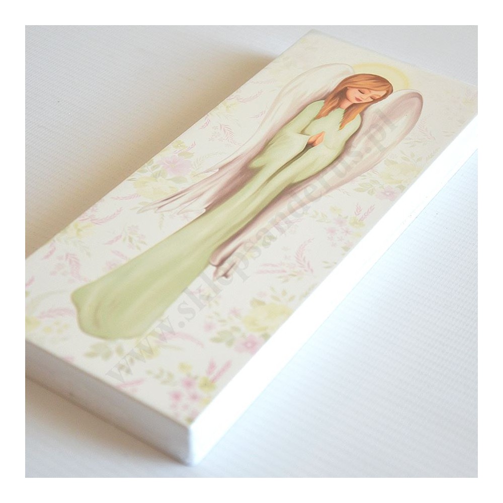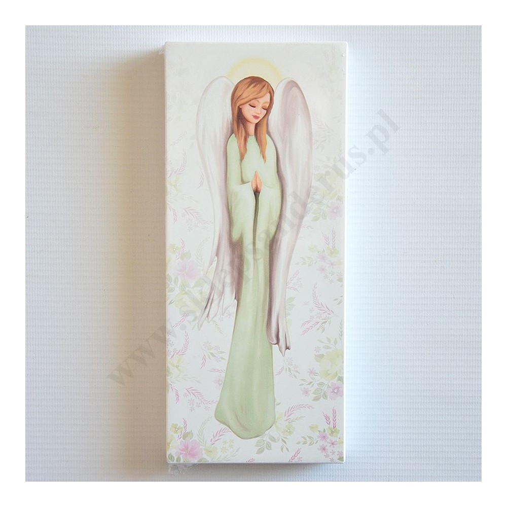 Obrazek przedstawiający anioła o wymiarach 9 x 21 cm zapakowany w oryginalne drewniane pudełko.