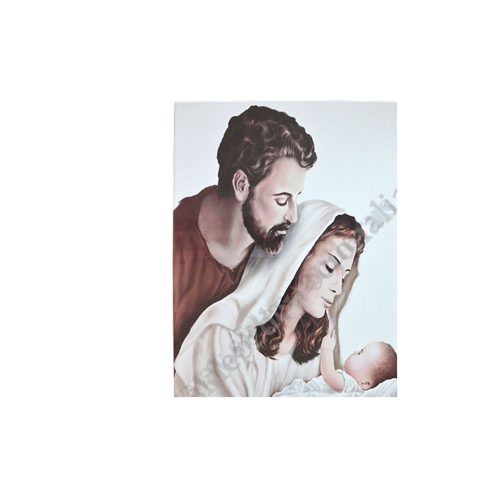 Nowoczesny obraz przedstawiający Świętą Rodzinę o szerokości 40 cm i wysokości 65 cm. PONIŻEJ W PRODUKTACH POWIĄZANYCH ISTNIEJE MOŻLIWOŚĆ ZAMÓWIENIA OKAZJONALNEJ DEDYKACJI NA TABLICZCE SREBRNEJ LUB ZŁOTEJ.