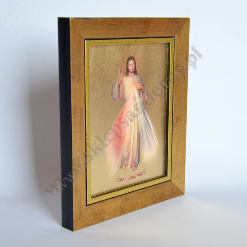 Obraz przedstawiający wizerunek Jezu Ufam Tobie w drewnianej ramie o wymiarach 18 x 22 cm. PONIŻEJ W PRODUKTACH POWIĄZANYCH ISTNIEJE MOŻLIWOŚĆ ZAMÓWIENIA OKAZJONALNEJ DEDYKACJI NA TABLICZCE SREBRNEJ LUB ZŁOTEJ.