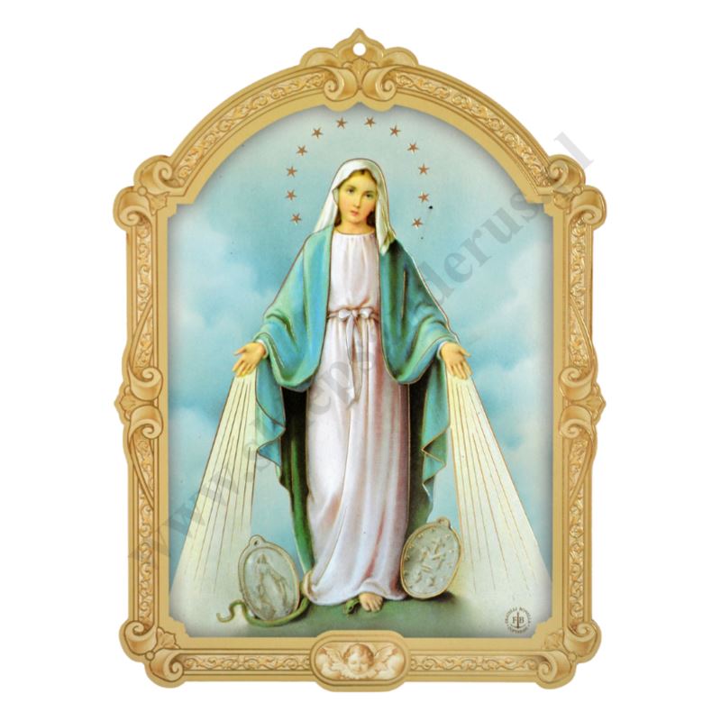 Obrazek Matki Bożej Niepokalanej na sklejce o grubości 3 mm. Szerokość obrazka 16.8 cm, wysokość 22.7 cm.