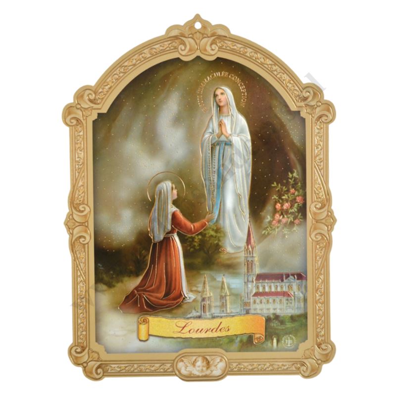 Obrazek Matki Bożej z Lourdes na sklejce o grubości 3 mm. Szerokość obrazka 16.8 cm, wysokość 22.7 cm.