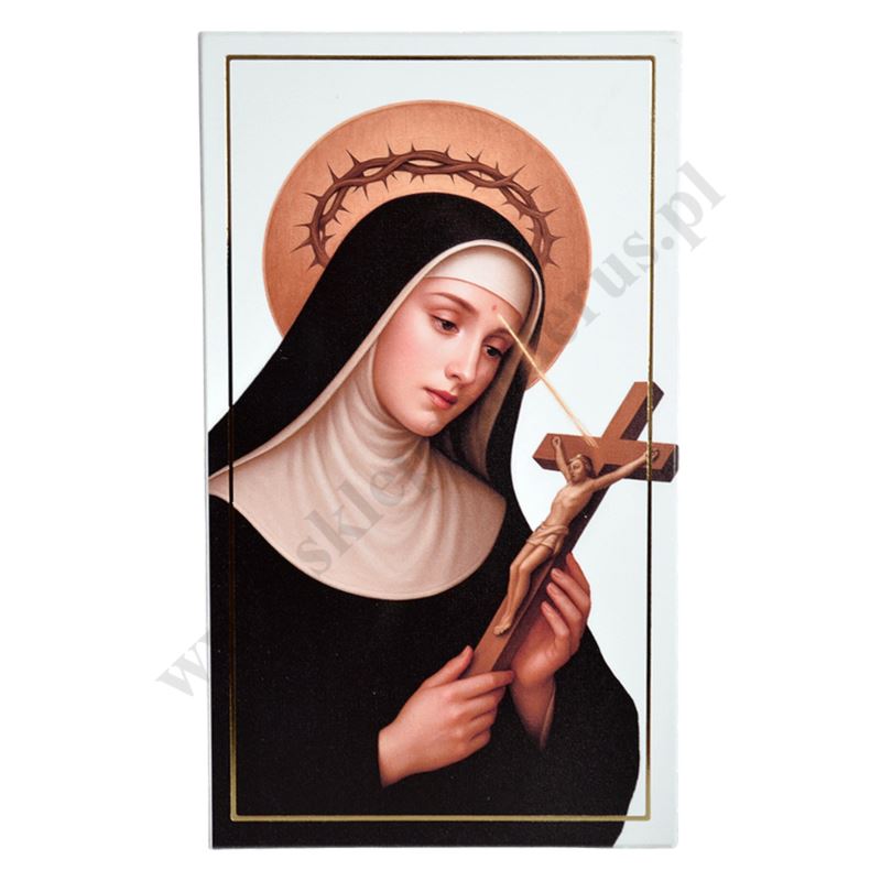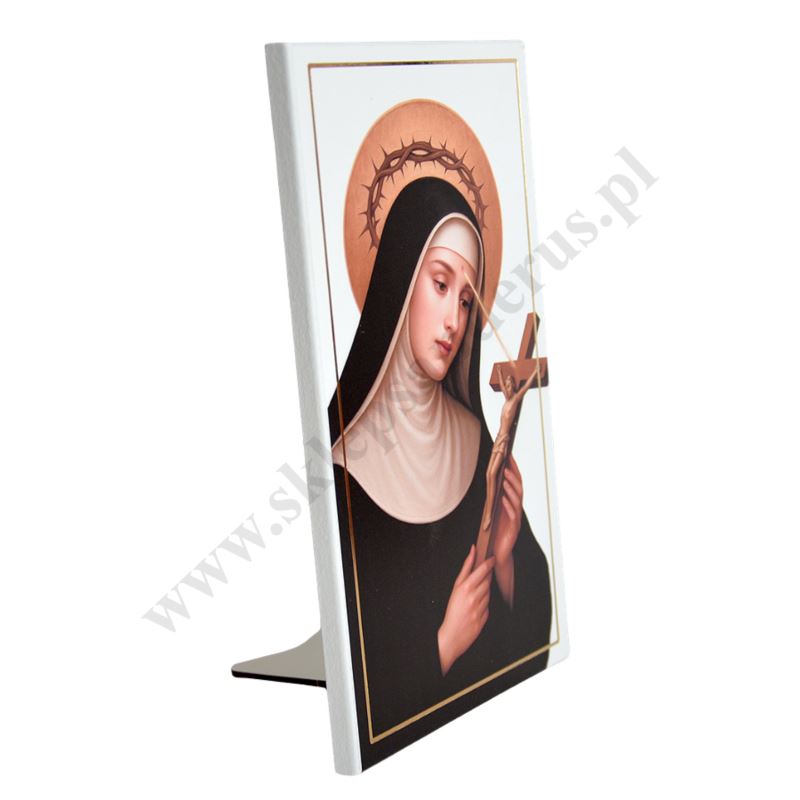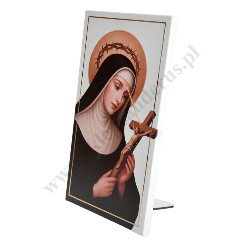 Drewniany obrazek przedstawiający wizerunek Świętej Rity w formacie 14 x 24 cm z możliwością powieszenia jak i postawienia. W PRODUKTACH POWIĄZANYCH ISTNIEJE MOŻLIWOŚĆ ZAMÓWIENIA OKAZJONALNEJ DEDYKACJI NA TABLICZCE LUB REWERSIE OBRAZKA.