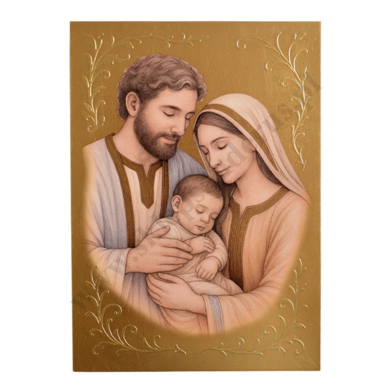 Ikona przedstawiająca wizerunek Świętej Rodziny w formacie 20 x 28 cm, wykonana przy użyciu unikalnej technologii druku na drewnie, pozwalającej na wierne odtworzenie oryginału. Materiał odporny na pęknięcia i deformacje.