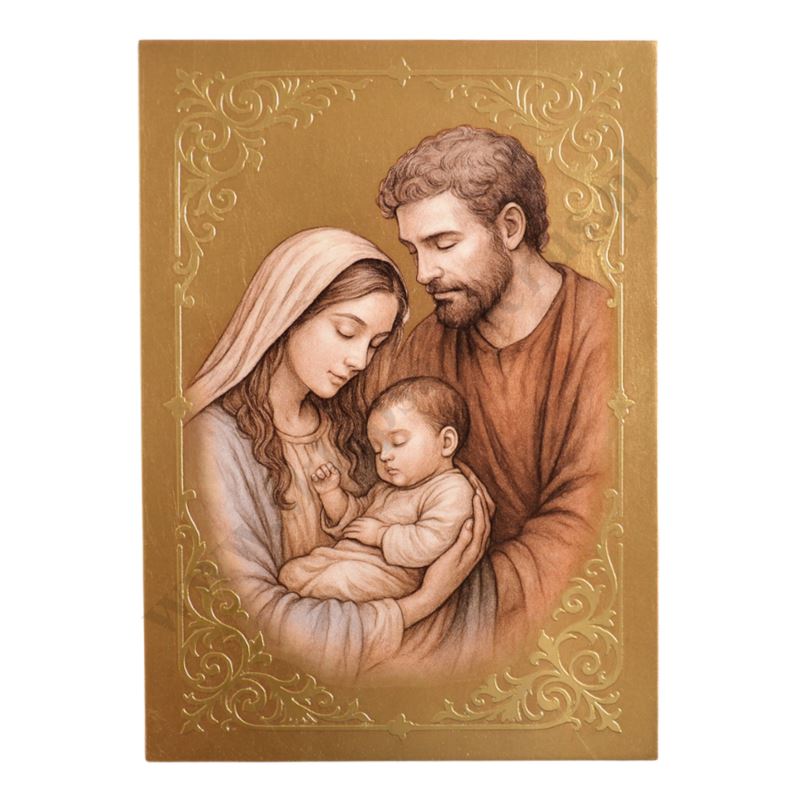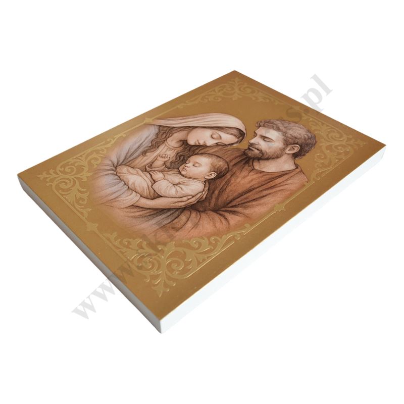 Ikona przedstawiająca wizerunek Świętej Rodziny w formacie 20 x 28 cm, wykonana przy użyciu unikalnej technologii druku na drewnie, pozwalającej na wierne odtworzenie oryginału. Materiał odporny na pęknięcia i deformacje.