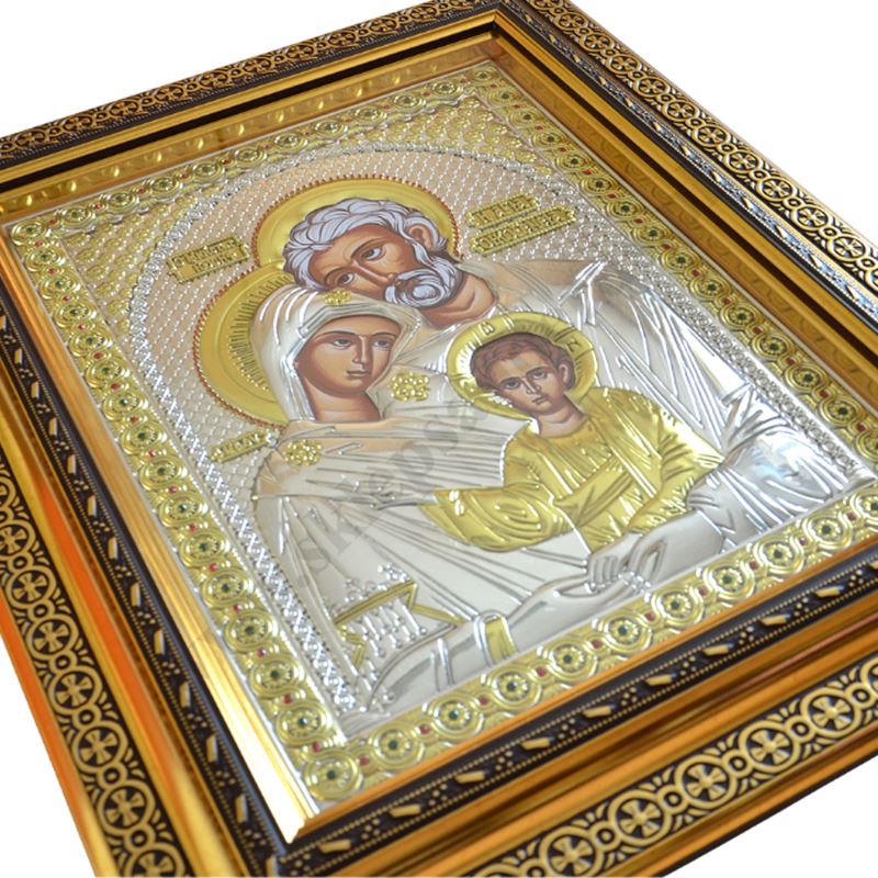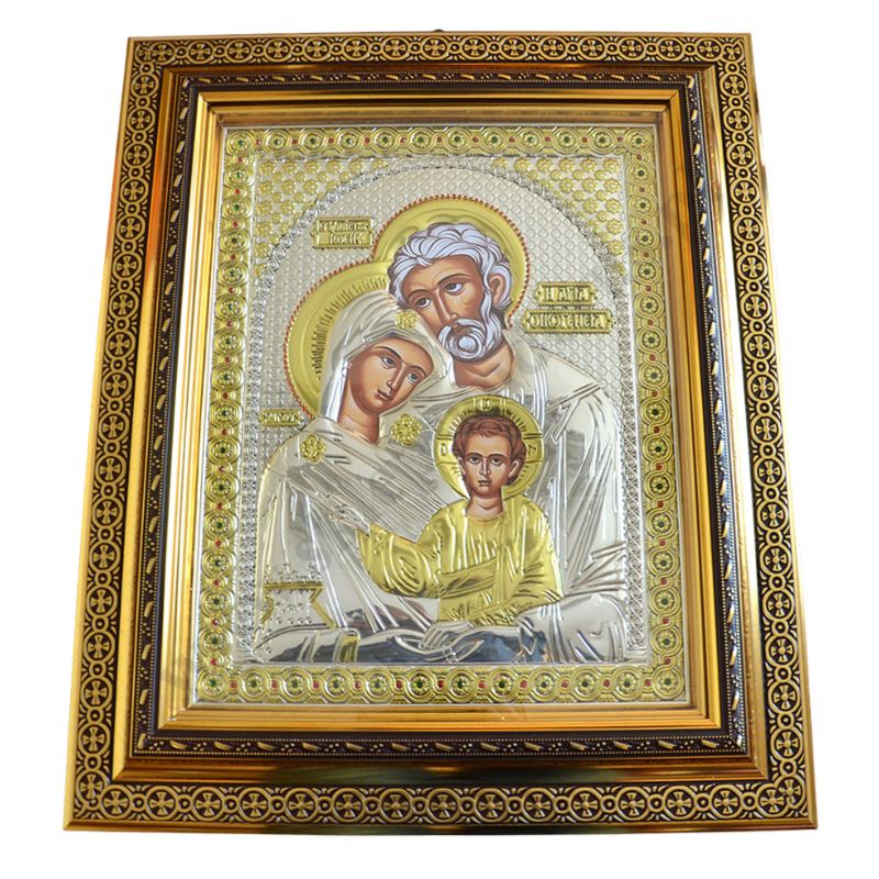 Ikona przedstawiająca Świętą Rodzinę wykonana techniką sitodruku w drewnie i płótnie, oprawiona wytłaczanym stopem PVD ze srebrem, pokrytym specjalnym lakierem ochronnym. Oprawiona w drewnianej ramce za szkłem. Ikona tylko do powieszenia. Szerokość 47.5 cm, wysokość 57 cm.