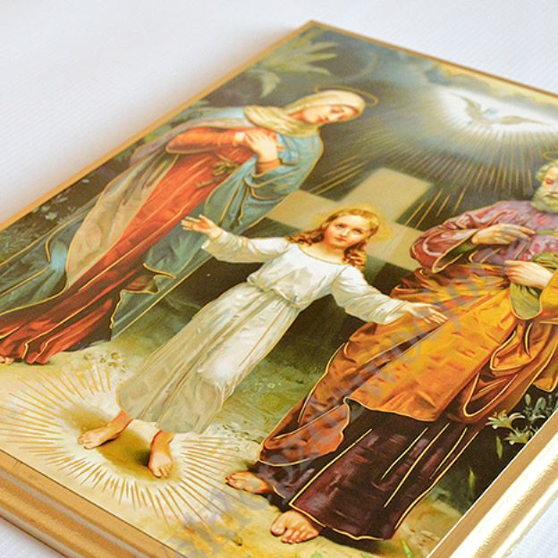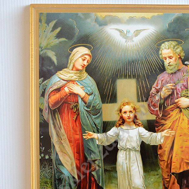 Obraz Świętej Rodziny naklejony na płytę pilśniową, utwardzaną profilowaną w wymiarze 18 x 25 cm. PONIŻEJ W PRODUKTACH POWIĄZANYCH ISTNIEJE MOŻLIWOŚĆ ZAMÓWIENIA OKAZJONALNEJ DEDYKACJI NA TABLICZCE LUB REWERSIE OBRAZKA.
