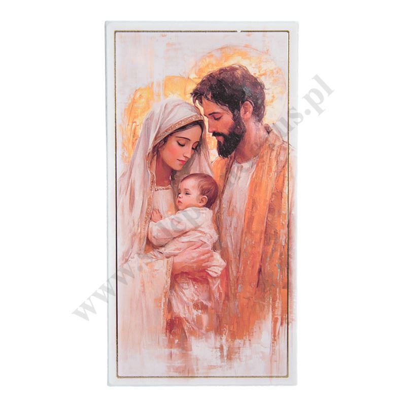 Drewniany obrazek przedstawiający wizerunek Świętej Rodziny w formacie 10 x 19 cm z możliwością powieszenia jak i postawienia. W PRODUKTACH POWIĄZANYCH ISTNIEJE MOŻLIWOŚĆ ZAMÓWIENIA OKAZJONALNEJ DEDYKACJI NA TABLICZCE LUB REWERSIE OBRAZKA.