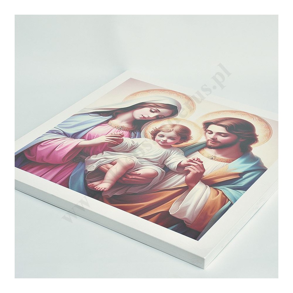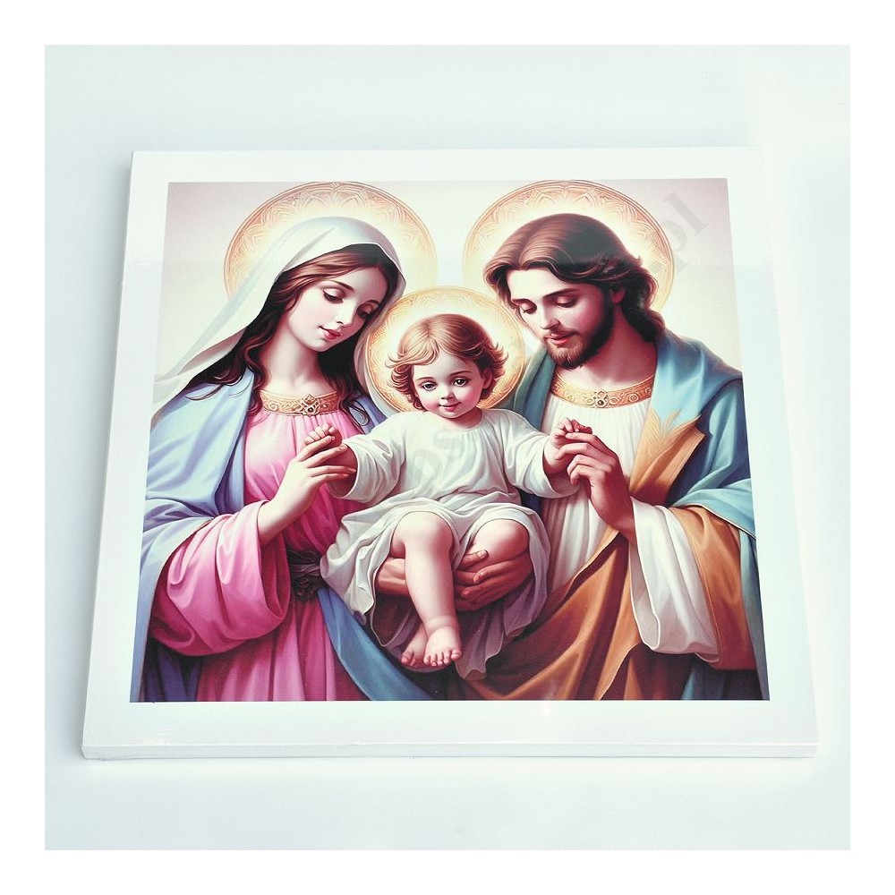 Nowoczesny obraz Świętej Rodziny o szerokości 40 cm i wysokości 40 cm. PONIŻEJ W PRODUKTACH POWIĄZANYCH ISTNIEJE MOŻLIWOŚĆ ZAMÓWIENIA OKAZJONALNEJ DEDYKACJI NA TABLICZCE SREBRNEJ LUB ZŁOTEJ.