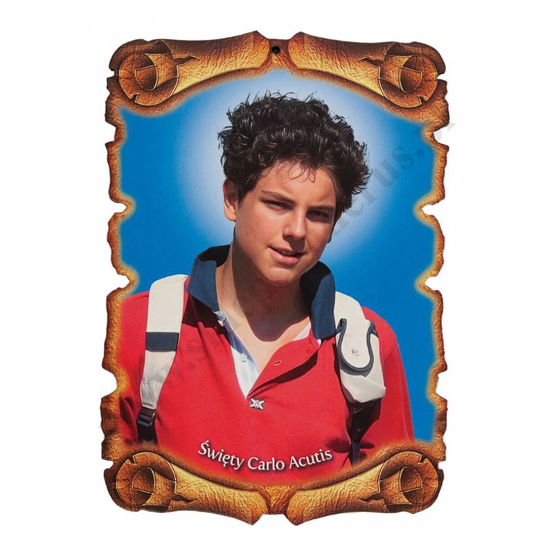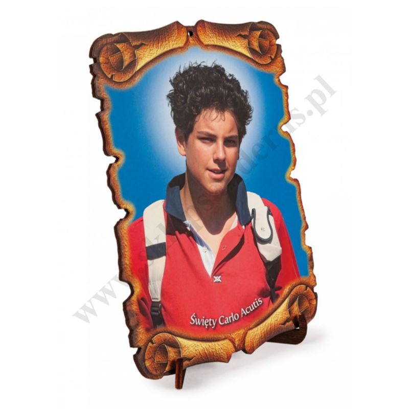 Obrazek na podstawce Świętego Carlo Acutisa w formacie 9.7 x 13.7 cm wykonany ze sklejki.