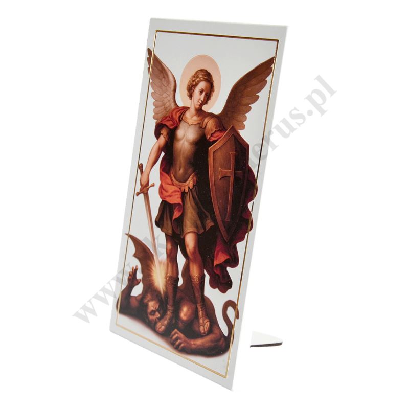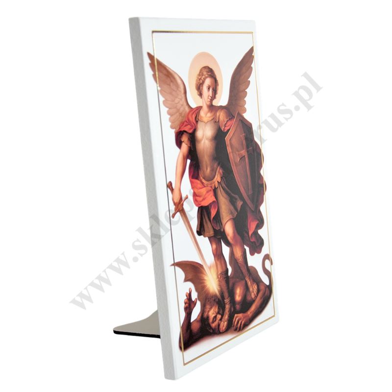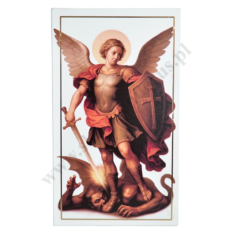 Drewniany obrazek przedstawiający wizerunek Świętego Michała Archanioła w formacie 14 x 24 cm z możliwością powieszenia jak i postawienia. W PRODUKTACH POWIĄZANYCH ISTNIEJE MOŻLIWOŚĆ ZAMÓWIENIA OKAZJONALNEJ DEDYKACJI NA TABLICZCE LUB REWERSIE OBRAZKA.