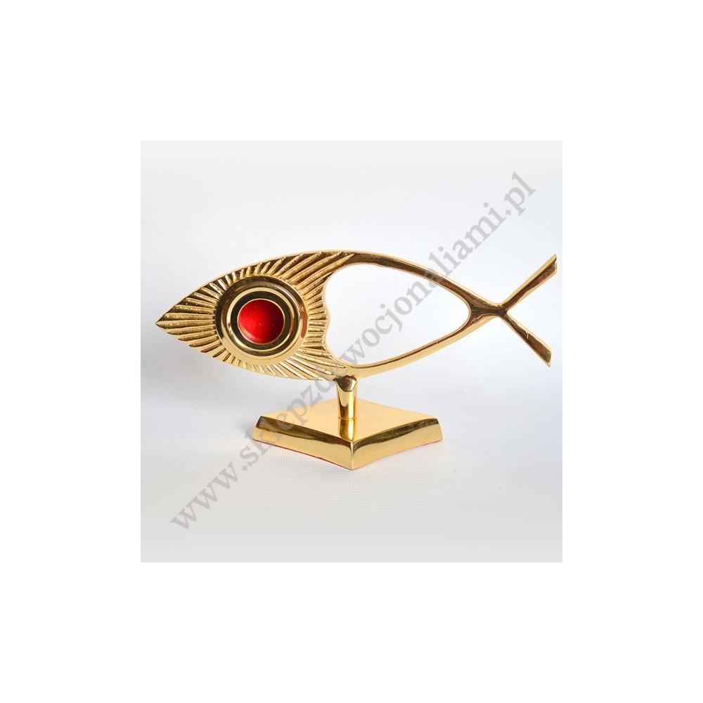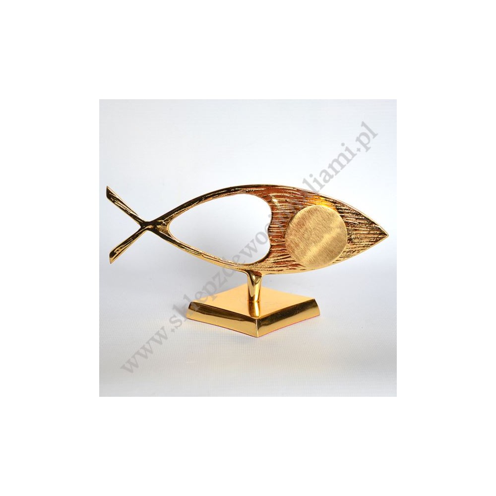 Relikwiarz mosiężny pozłacany o wysokości 11 cm, szerokości 21.4 cm, szerokość podstawy 10.6 cm, głębokość podstawy 8.3 cm, średnica wewnętrzna luny na relikwie ok. 3.8 cm.