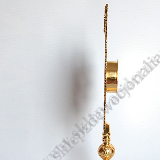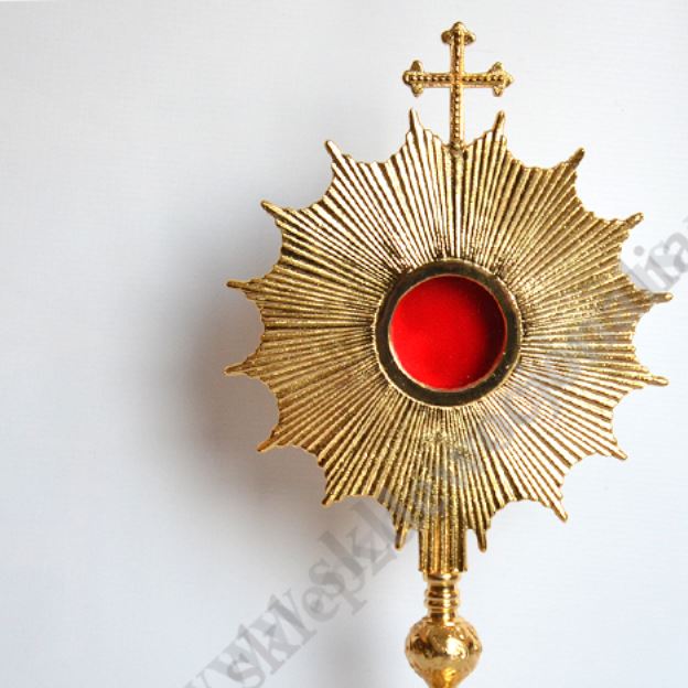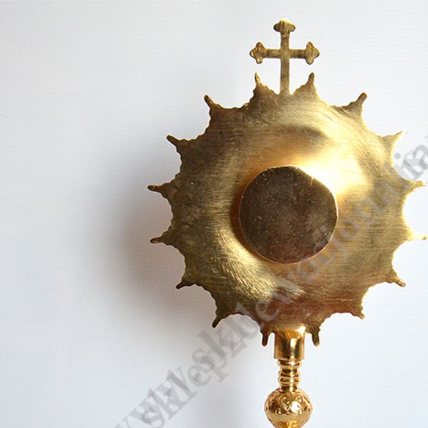 Relikwiarz mosiężny, pozłacany o wysokości 37 cm.