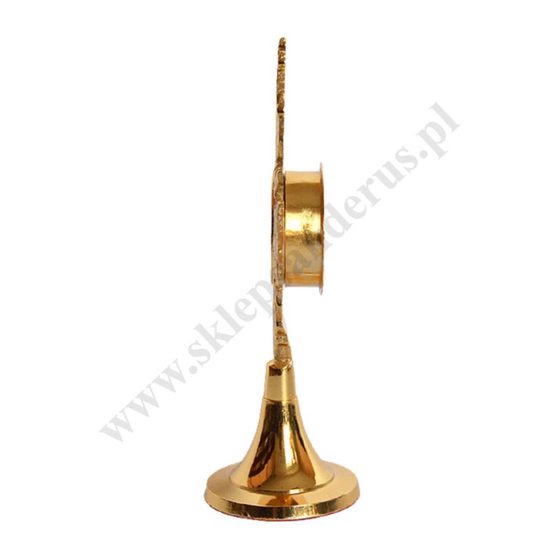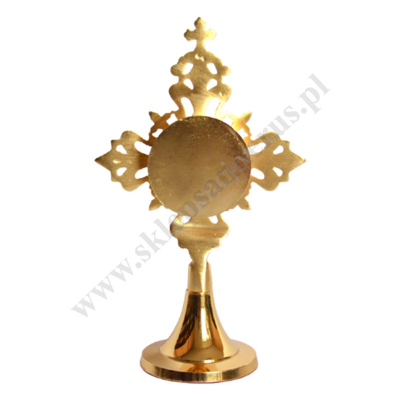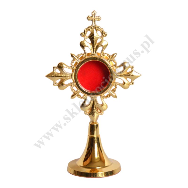 Relikwiarz mosiężny, pozłacany o wysokości 16.7 cm.