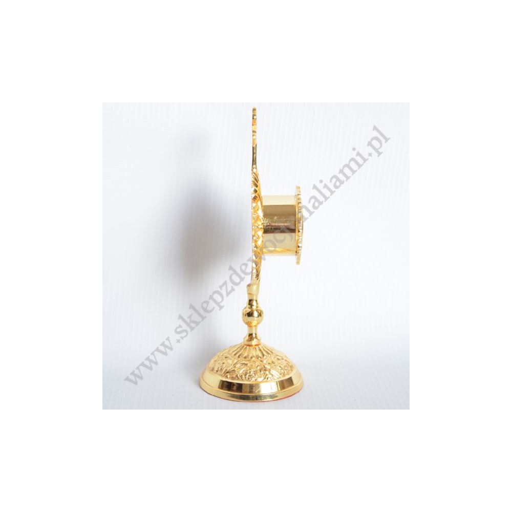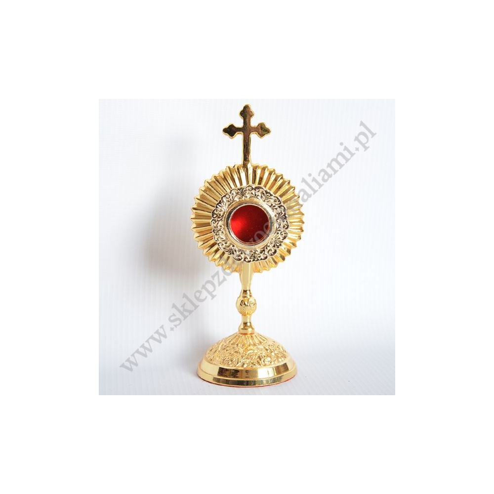 Relikwiarz mosiężny pozłacany o wysokości 16.4 cm.