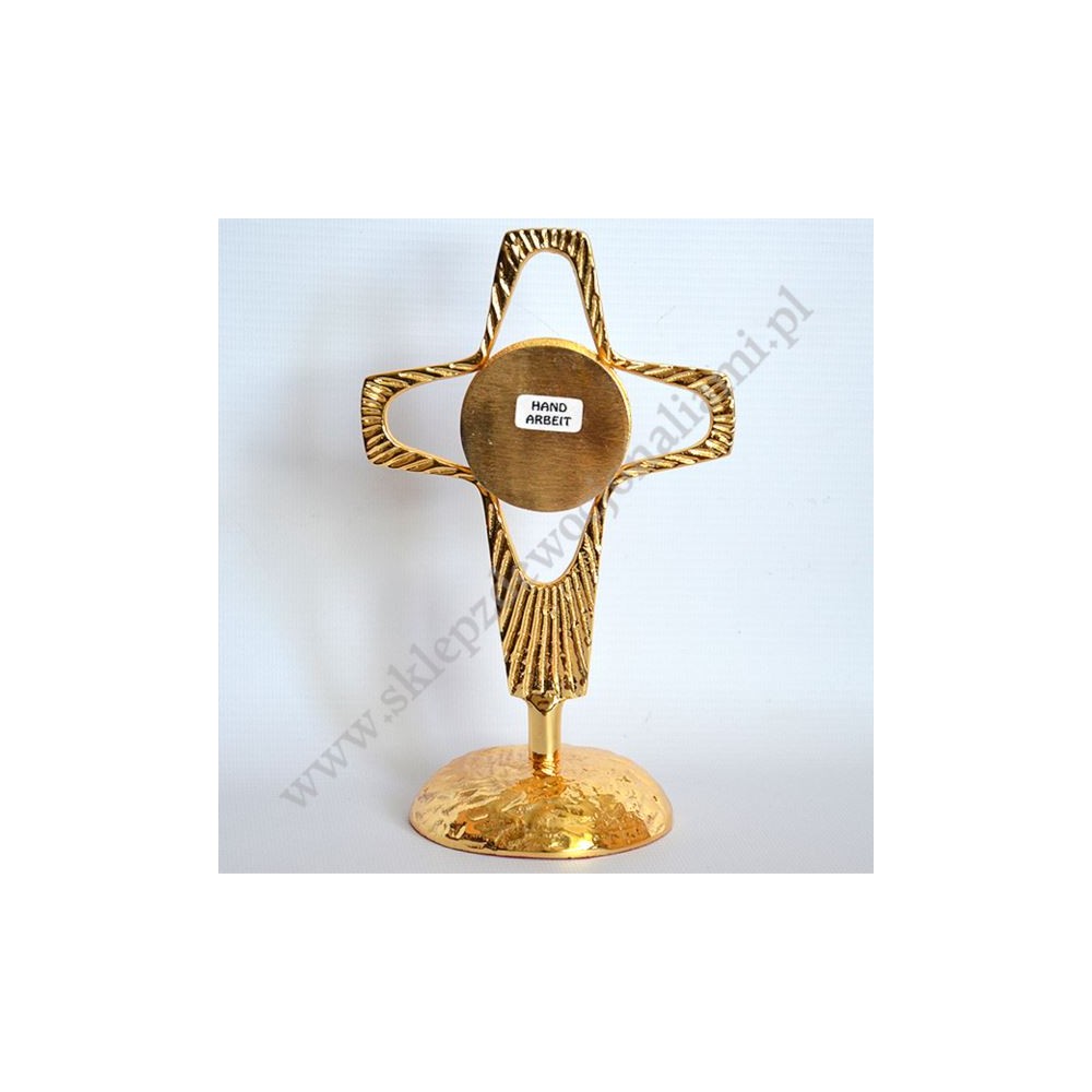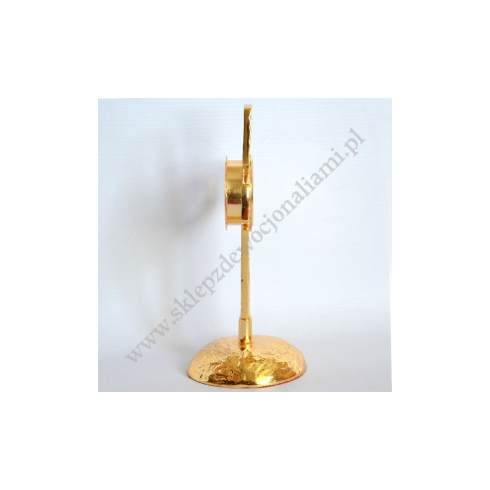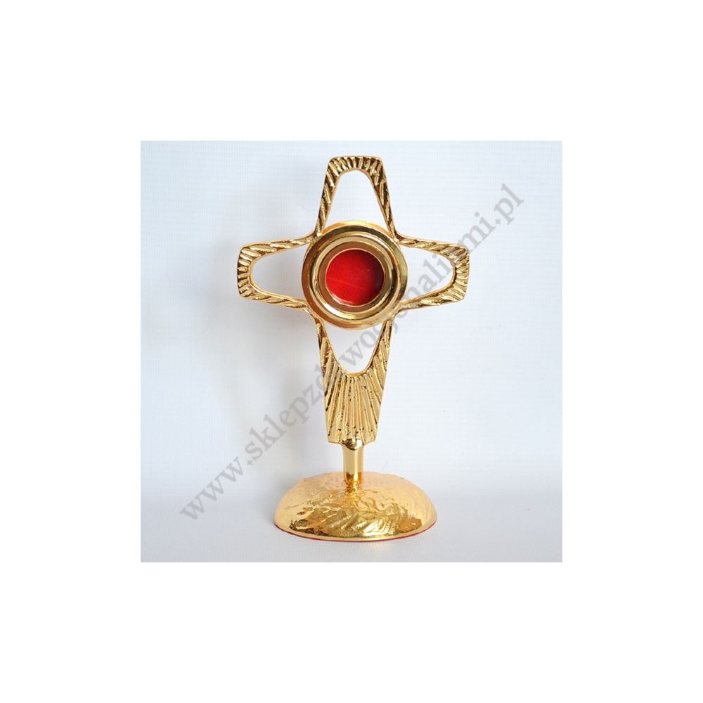 Relikwiarz w postaci krzyża ażurowego o wysokości 19 cm i szerokości 12 cm, średnica podstawy 8.6 cm, średnica oczka na relikwie 4.4 cm.
