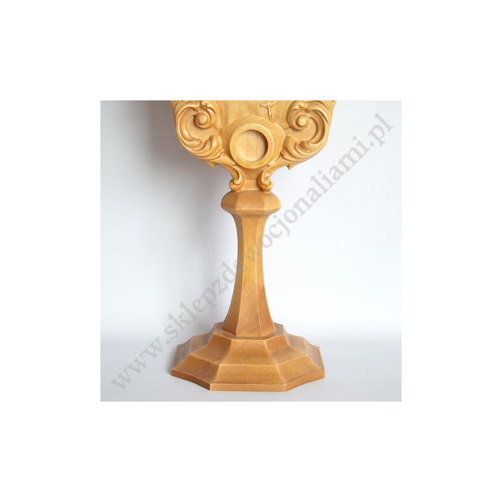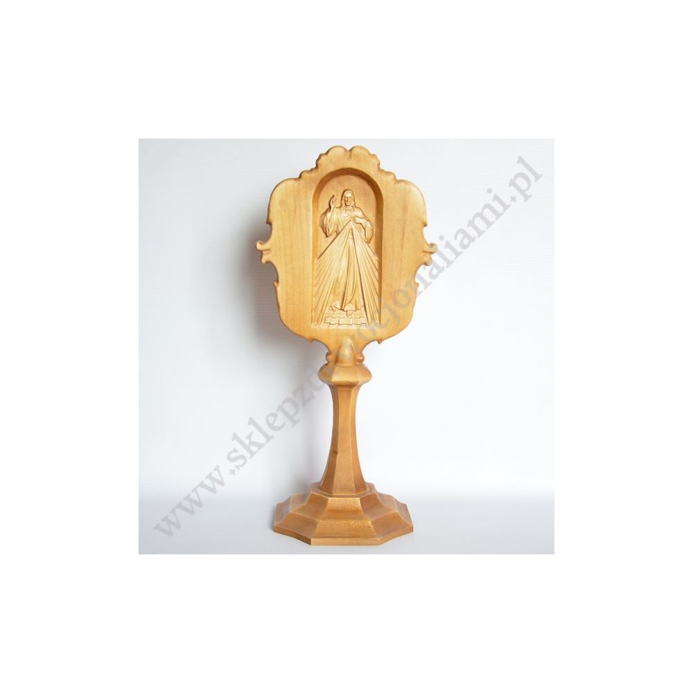 Drewniany relikwiarz na relikwie Świętej Faustyny o wysokości 35 cm.