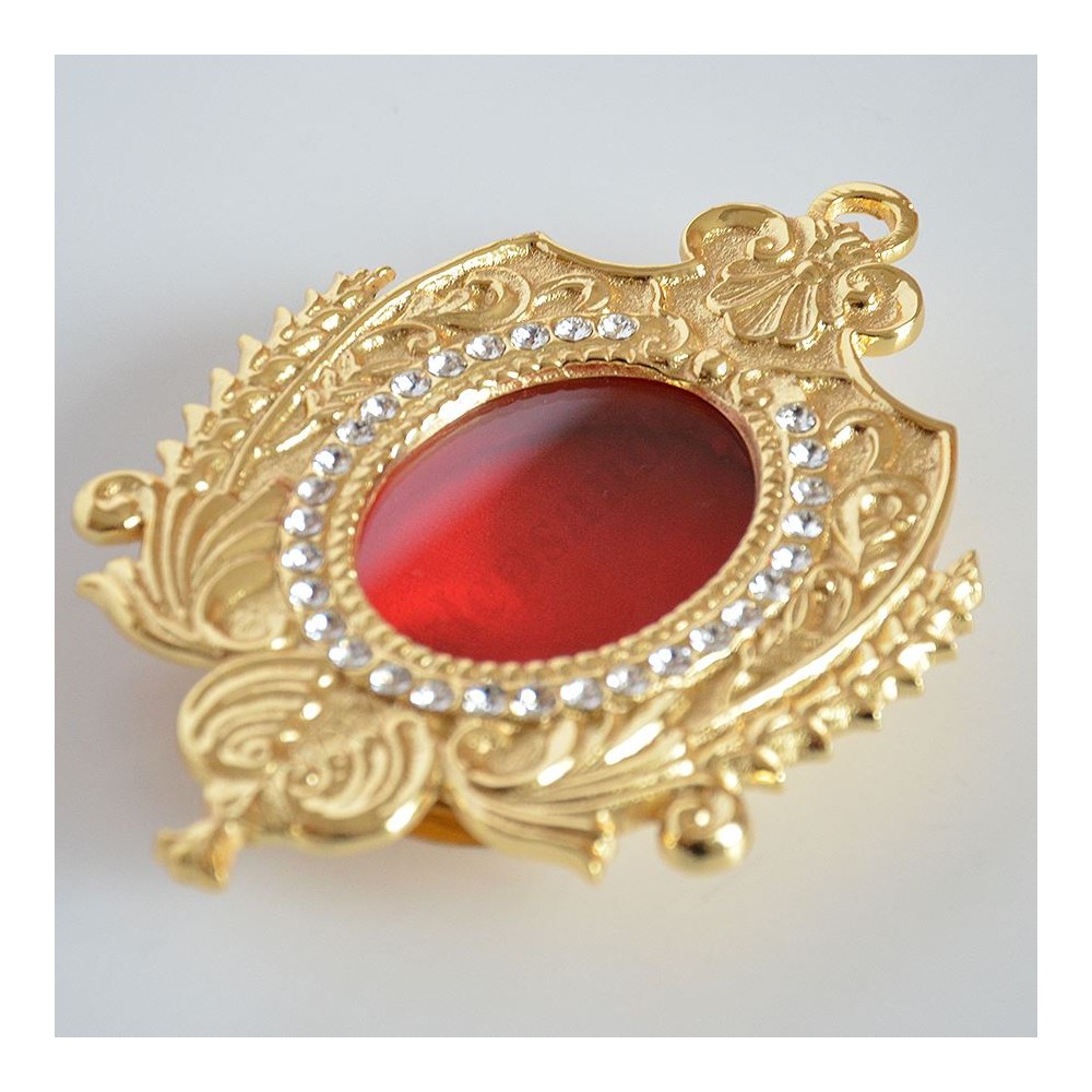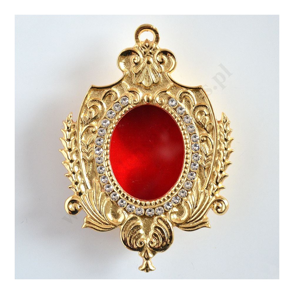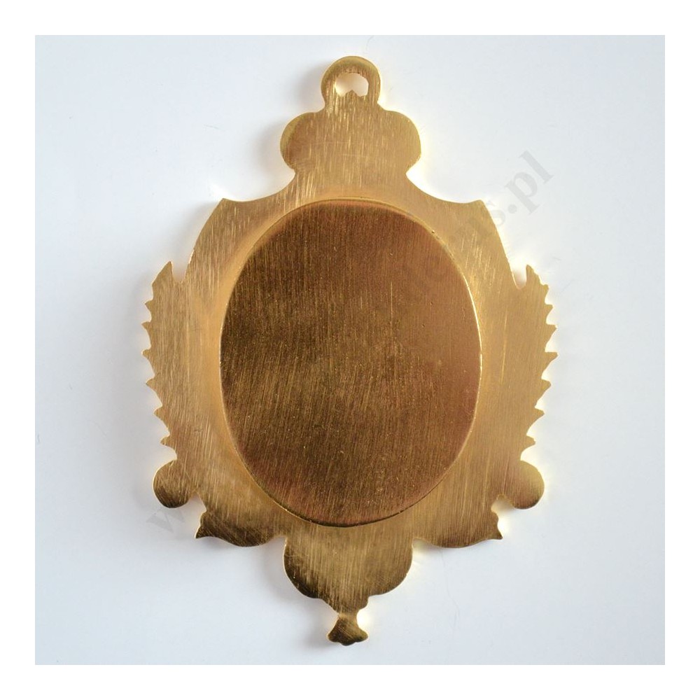 Relikwiarz ścienny mosiężny, pozłacany o wysokości 13.5 cm i szerokości 9.5 cm.
