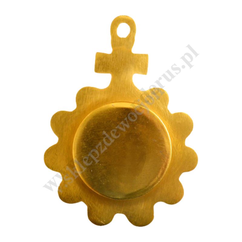 Relikwiarz ścienny mosiężny, pozłacany o wysokości 11.5 cm i szerokości 8.4 cm.