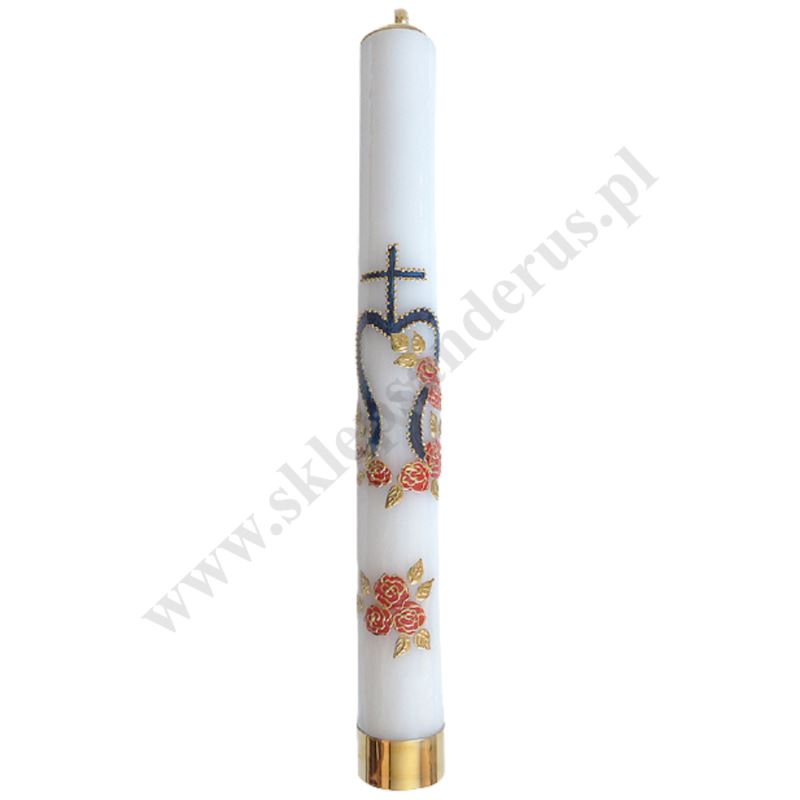 Świeca roratnia olejowa, ręcznie malowana i zdobiona z wkładem olejowym. Wysokość świecy 60 cm, średnica 7 cm. Dół świecy zakończony metalowym okuciem.