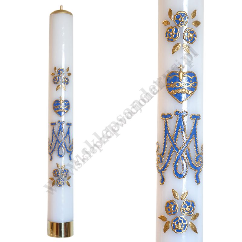 Świeca roratnia olejowa, oblewana parafiną, ręcznie malowana i zdobiona z wkładem olejowym. Wysokość świecy 60 cm, średnica 7 cm. Dół świecy zakończony metalowym okuciem.