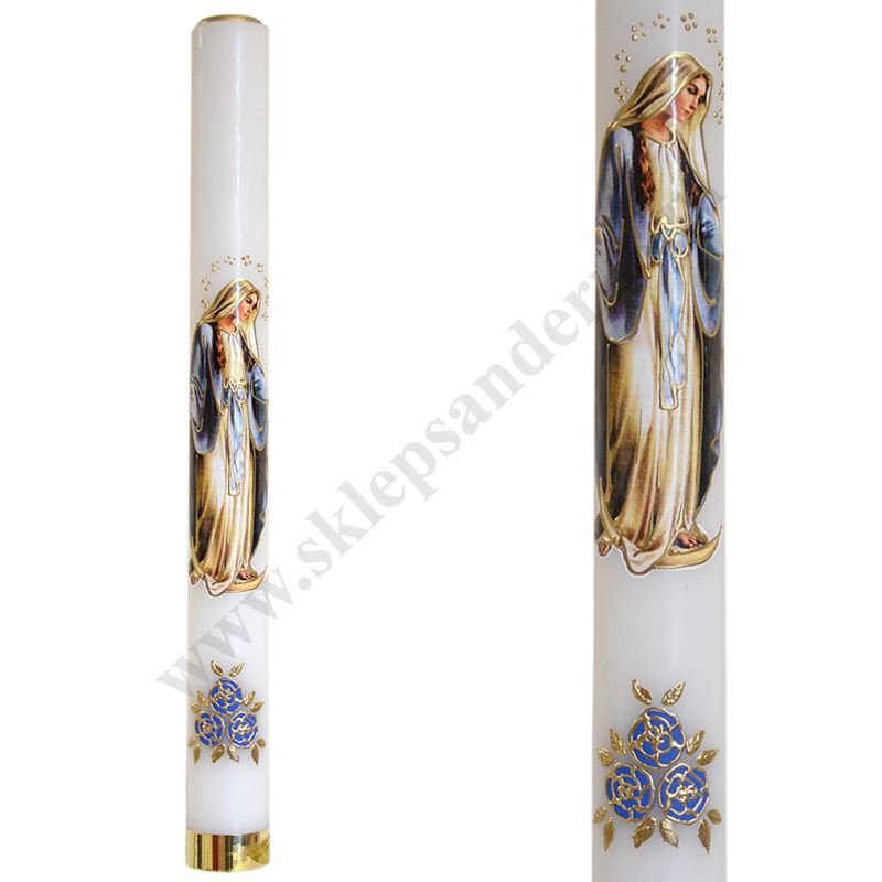 Świeca roratnia olejowa, oblewana parafiną bez wkładu olejowego o wysokości 80 cm i średnicy 8 cm, zdobienia malowane ręcznie.