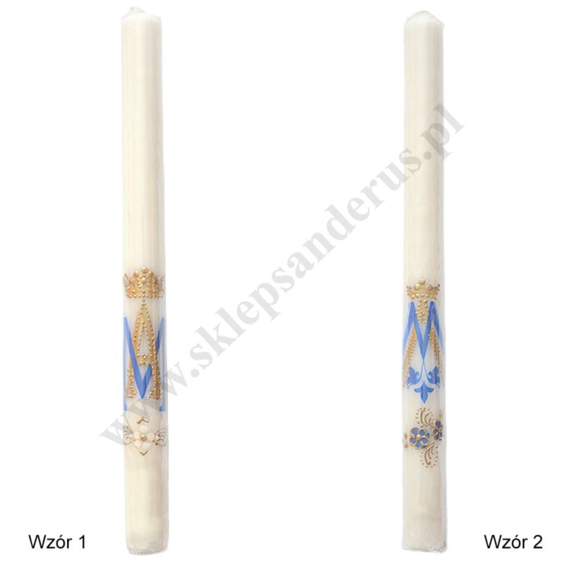 Świeca roratnia spalana, zdobiona ręcznie o wysokości 60 cm i średnicy 5 cm. Dostępna w dwóch wzorach.