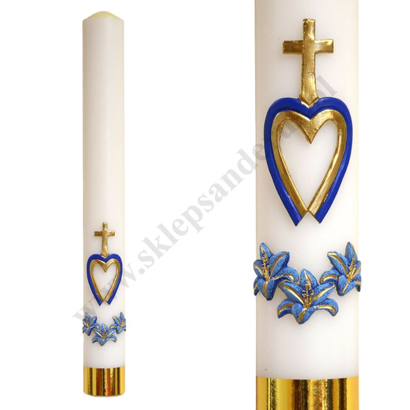 Świeca roratnia parafinowa, spalana o wysokości 70 cm i średnicy 8 cm, zdobiona przestrzennymi, parafinowymi aplikacjami.