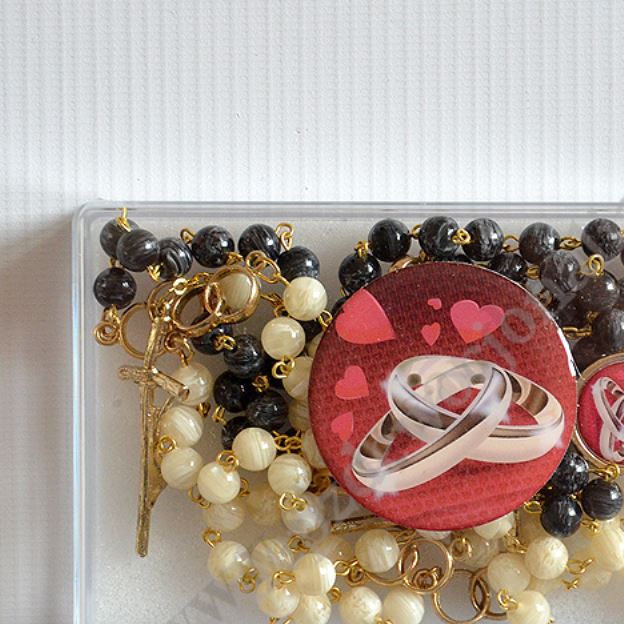 Komplet dwóch różańców ślubnych w plastikowym pudełeczku. Długość różańców ok. 55 cm, średnica koralika 7 mm.