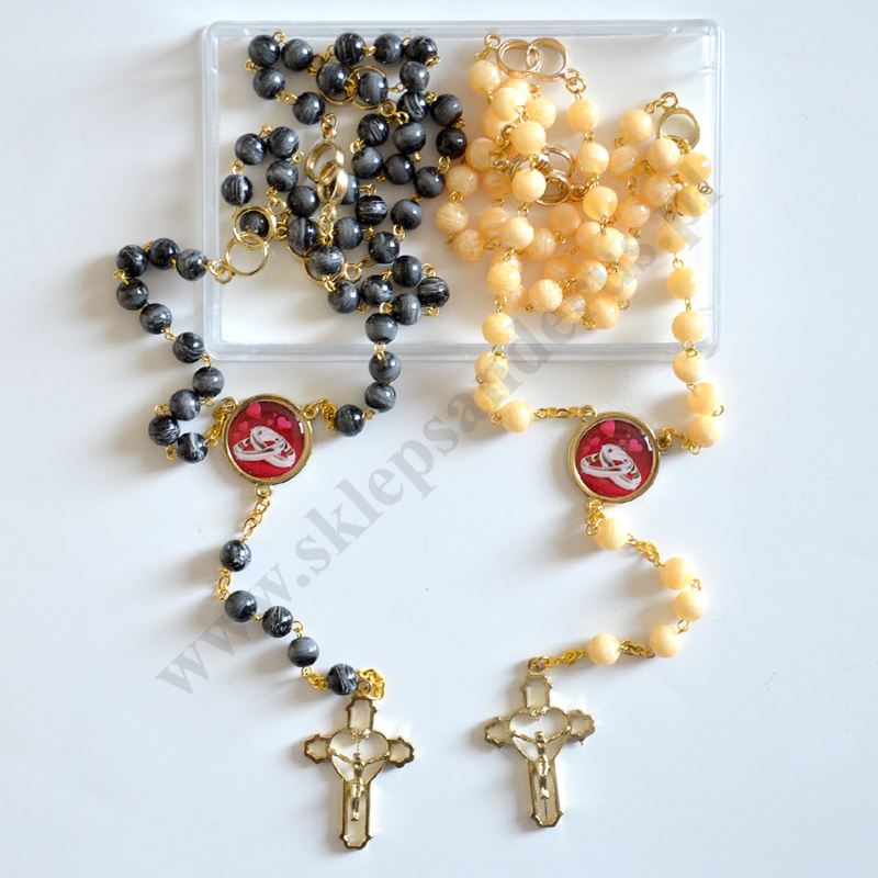 Komplet dwóch różańców ślubnych zapakowanych w plastikowym pudełku. Długość różańca 55 cm, średnica kólki ok. 7 mm.