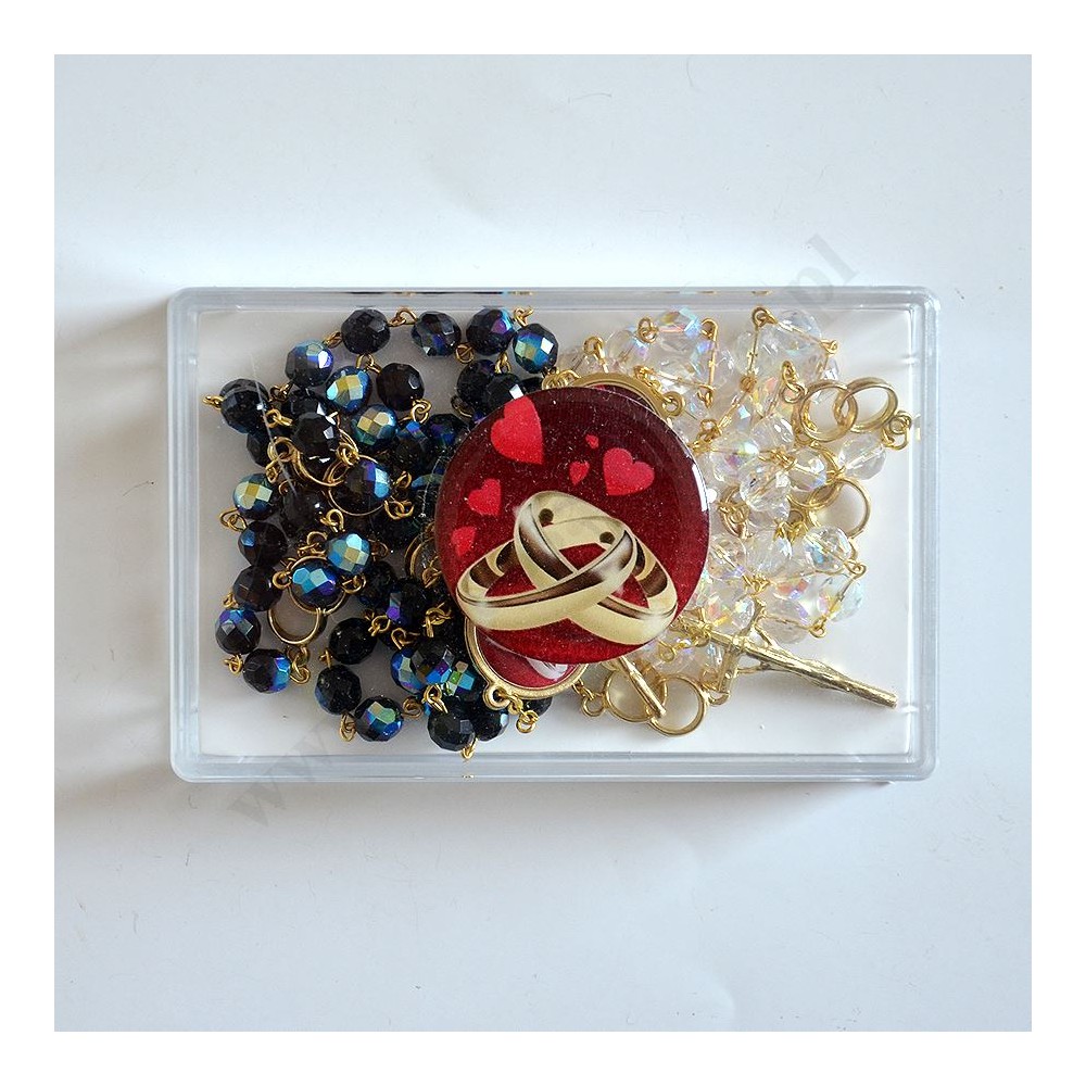 Komplet dwóch różańców ślubnych zapakowanych w plastikowym pudełku. Długość różańca 55 cm, średnica kólki ok. 7 mm.