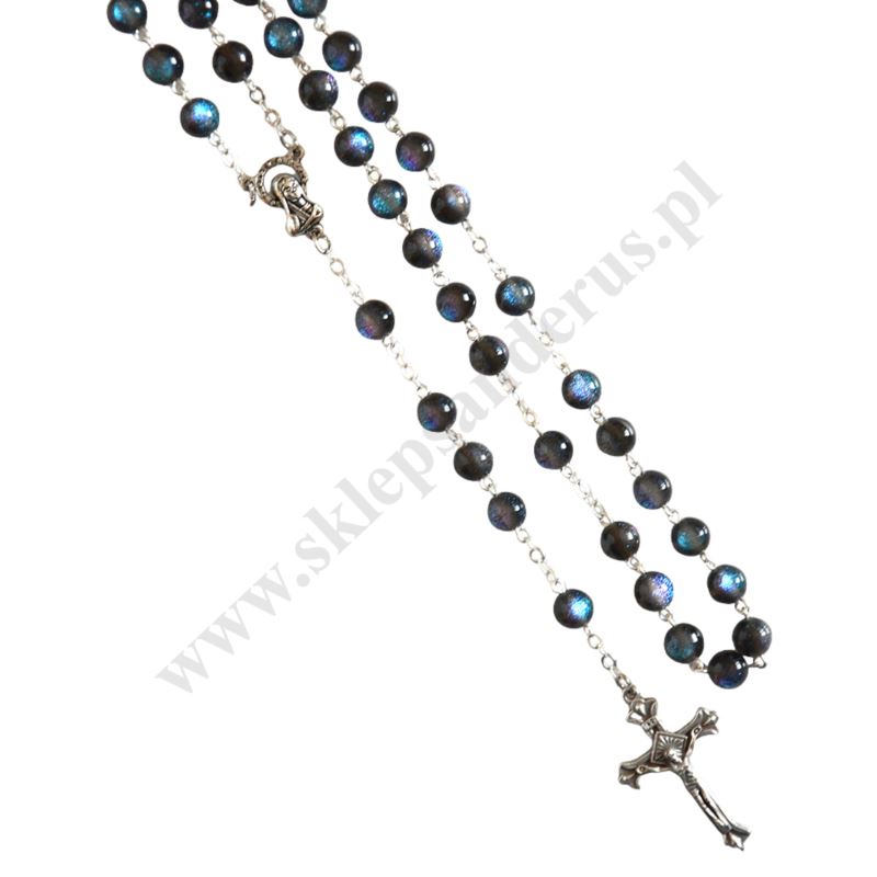Różaniec wykonany z tworzywa sztucznego i metalu. Długość różańca 54 cm, średnica koralika ok. 8 mm