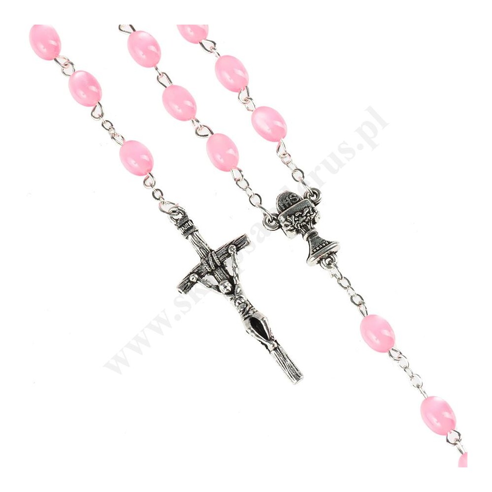 Różaniec wykonany z plastiku i stali nierdzewnej, średnica koralika 8 mm.