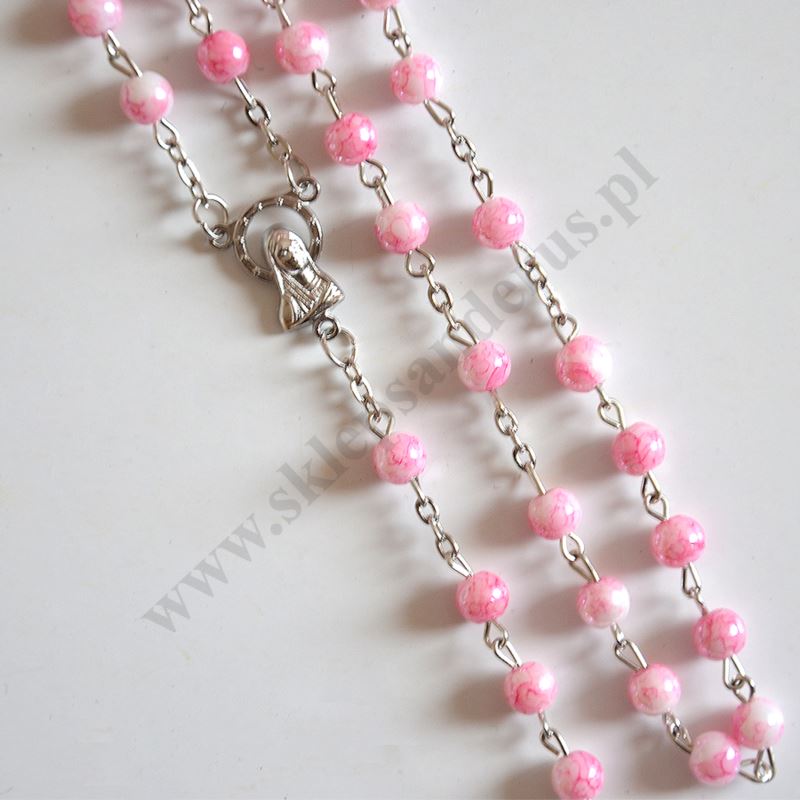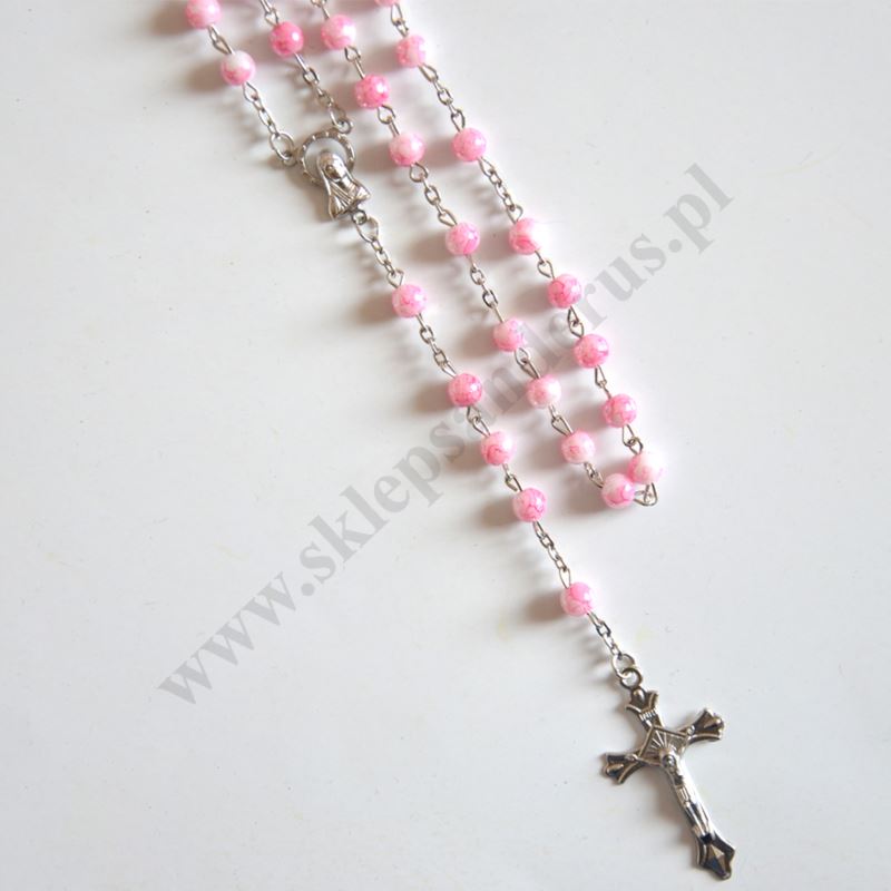 Różaniec o długości ok. 50 cm, średnica koralika ok. 5 mm. Różaniec w plastikowym pudełeczku.