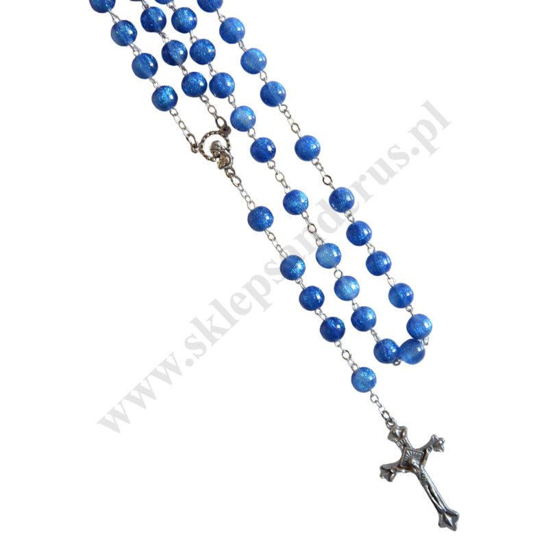 Różaniec wykonany z tworzywa sztucznego i metalu o długości ok. 50 cm, średnica koralika ok. 8 mm.