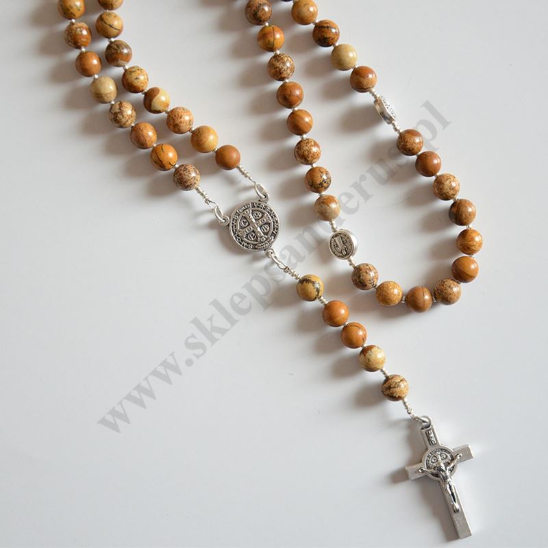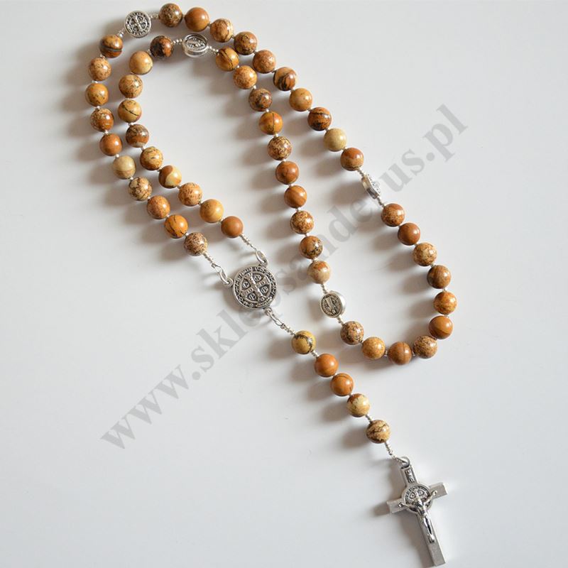 Różaniec wykonany z kamienia półszlachetnego jaspis krajobrazowy, łączniki i krzyżyk metalowe Świętego Benedykta. Długość różańca ok. 39 cm, średnica koralika ok. 8 mm.