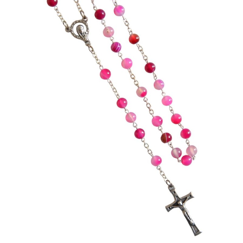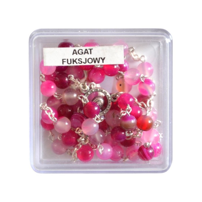 Różaniec o długości 45 cm, koraliki wykonane z kamienia półszlachetnego agat fuksjowy o średnicy koralika ok. 6 mm. Różaniec w plastikowym pudełeczku.