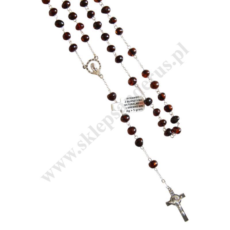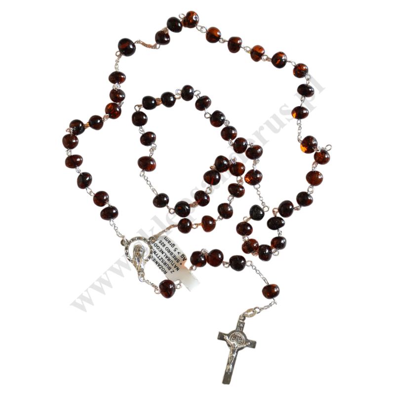 Różaniec, którego koraliki wykonane są z bursztynu naturalnego o średnicy ok.6 mm na srebrnym łańcuszku, medalik Świętego Benedykta oraz krzyżyk również wykonane ze srebra, próba srebra 925. Długość różańca ok. 48 cm.