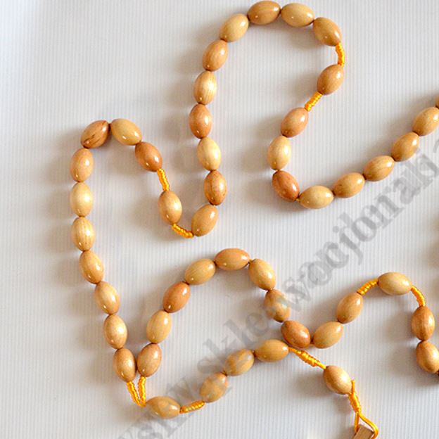 Drewniany różaniec dekoracyjny o długości 127 cm, 3 x 1.8 cm wymiar koralika.